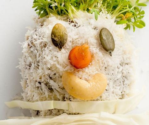 We used garden cress, celery, pumpkin seeds, carrot, white cabbage strings, hazelnuts and cashew nuts.