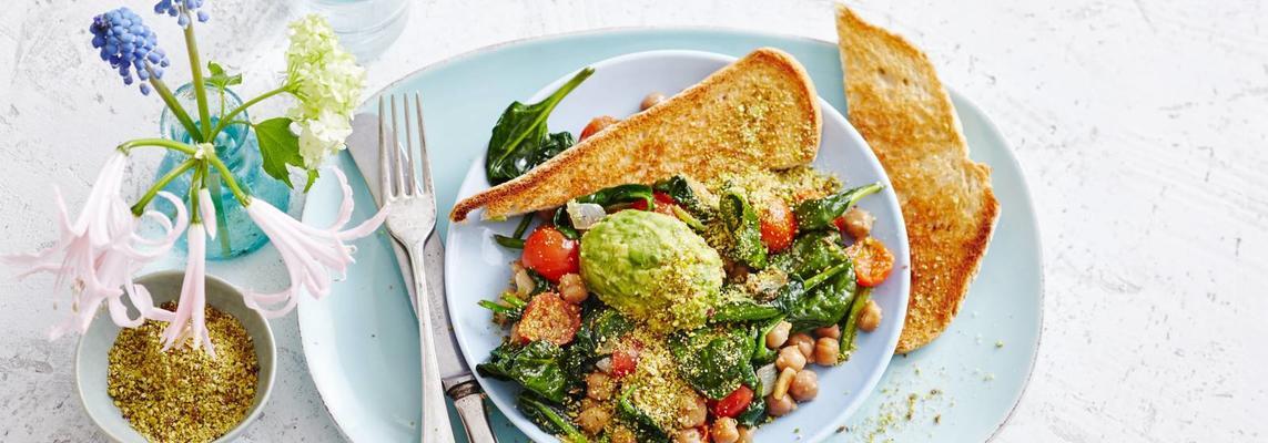 Toast with tomatoes, spinach, chickpeas, avocado puree and pistachio spice mixture.