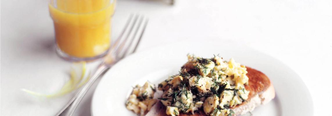 A tasty recipe. The vegetarian brunch contains the following ingredients: eggs, whipped cream, butter, choice :, tomatoes (diced), fresh dill (chopped), 4-season pepper (mill), -old cheese (grated), fresh basil ( (container 15 g) and in strips).