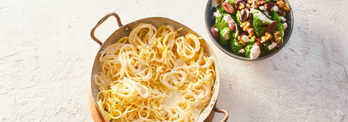 Spaghetti with a sauce of Parmesan cheese and freshly ground pepper, olives, broccoli florets, walnuts and yoghurt.