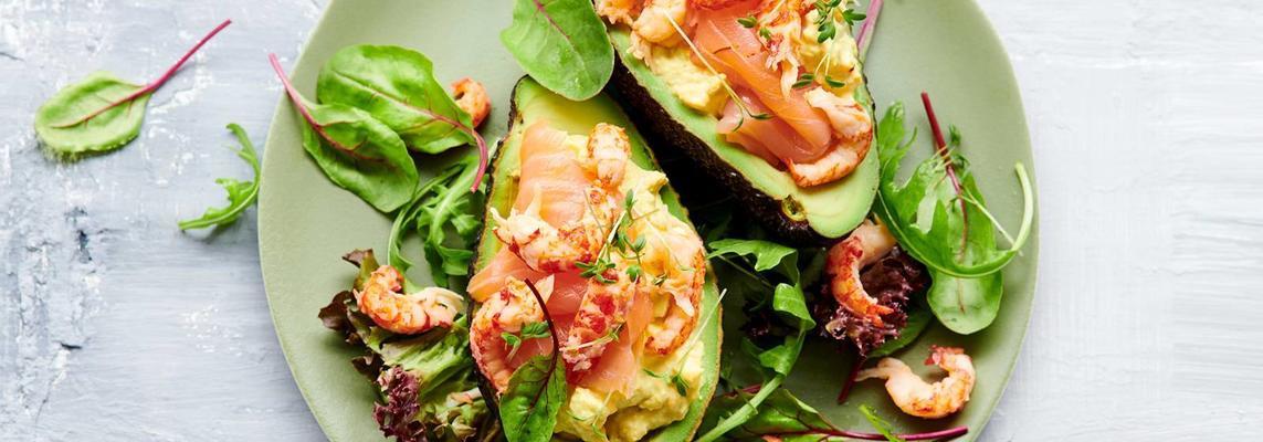 Stuffed avocado with egg salad, salmon and crayfish