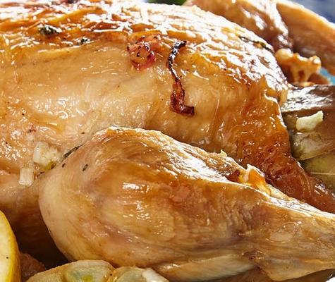 Cut the garlic bulbs and the lemons in half and put them around the chicken. Put the oven dish in the oven and let the chicken roast for about 40 minutes.